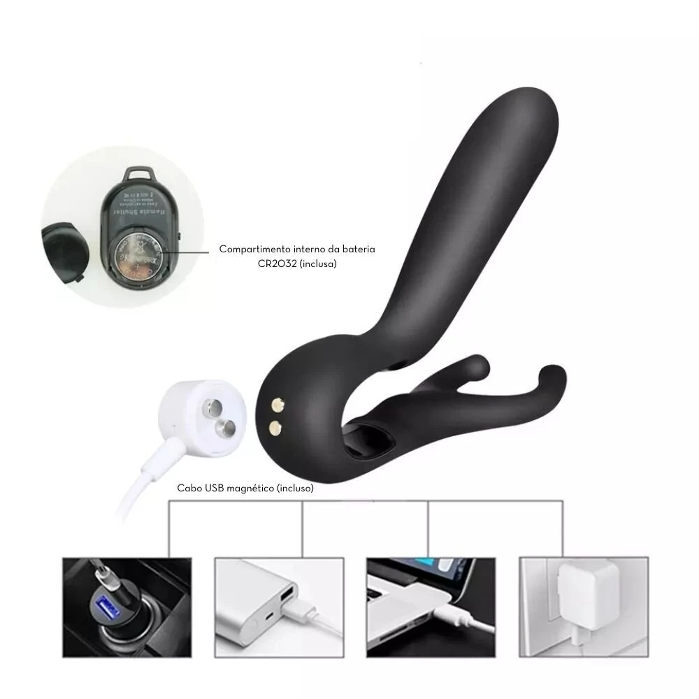 Massageador – Recarregável USB (cabo magnético incluso) / Controle – Utiliza 1 bateria CR2032