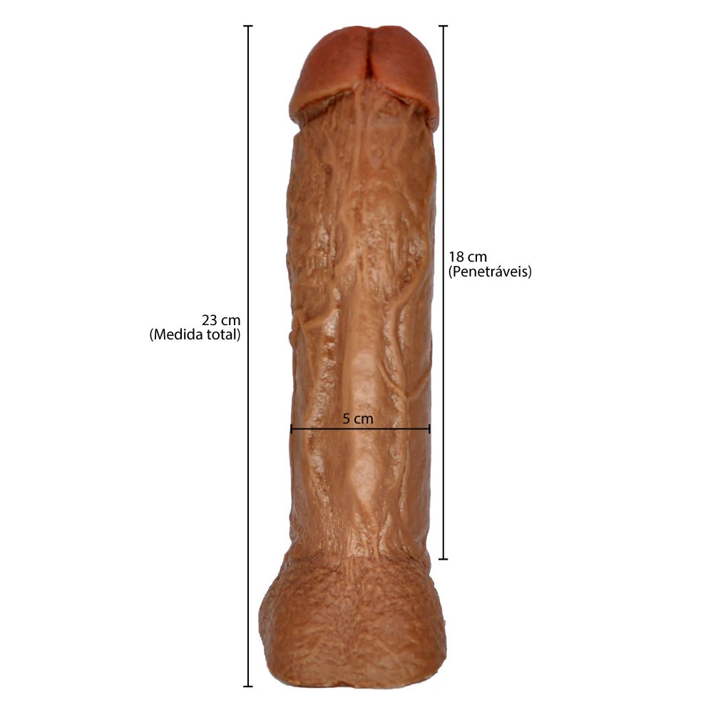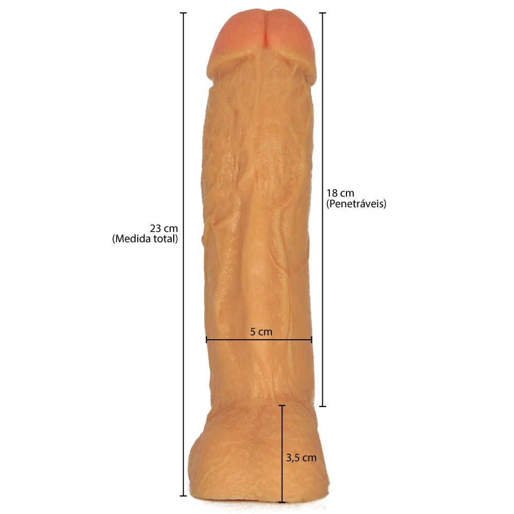 Altura total: 23 cm ; Penetráveis: 18 cm ; Diâmetro: 5 cm ; Escroto: 3,5 cm.
